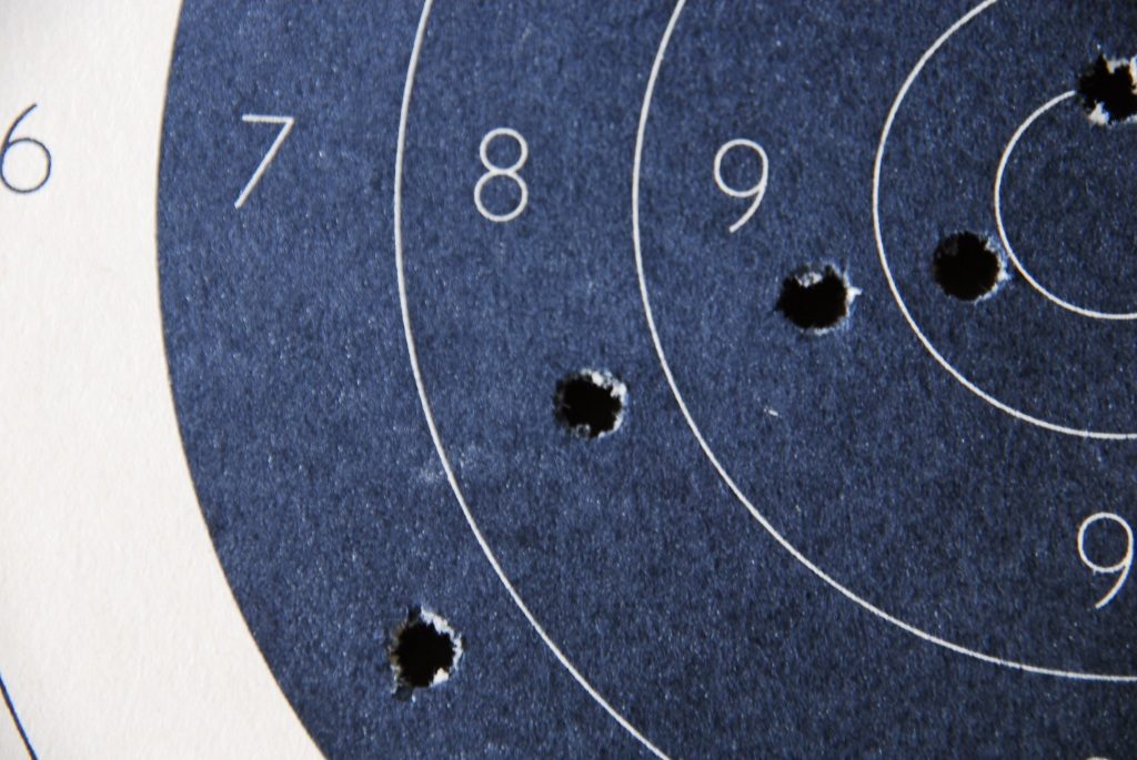 Еще перерыв на четверть часа и контрольные стрельбы по бумаге с той же сотни метров. Целится без бутылки сложнее, но все-же у меня получается. Группа из четырех выстрелов ложится в три десятки и одну девятку. Размер группы -42 мм.
